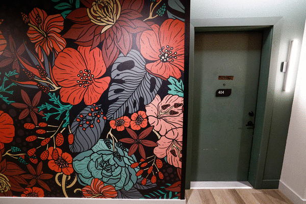 The mural was created by illustrator Karen Sue Chen. Inside of Oak Lawn Place, art is plentiful. Turn a corner and you’ll find video installations, floral murals and photo walls.