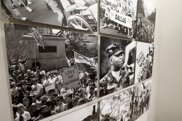 One photo wall in black-and-white includes shots of Dallas’ queer community members at the March on Washington in 1993. Kincaid said many of the original photos were blurry negatives, so he used AI to make some of the images clearer. He was able to enhance a photo of former state Rep. Harryette Ehrhardt, a powerful advocate in the LGBTQ community nicknamed “Fairy Godmother of Texas,” and other allies on a pride float.