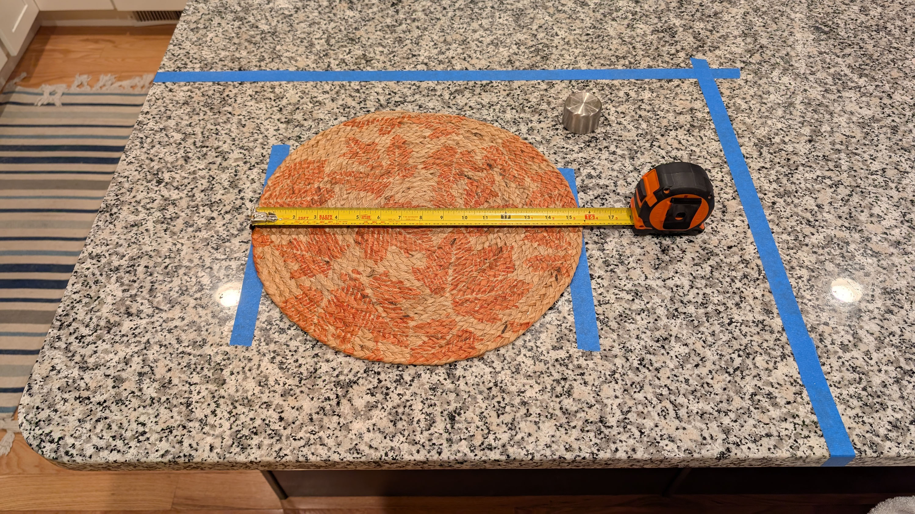 Next up, I told my son to take some painter’s tape and create an outline of his stone vanity top. He created a rectangle on his island countertop using the tape. The outline was 31 inches wide and 22 inches deep. This produced a 1-inch overhang on the front and left side of the vanity cabinet.